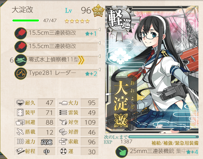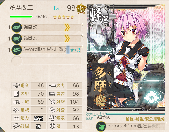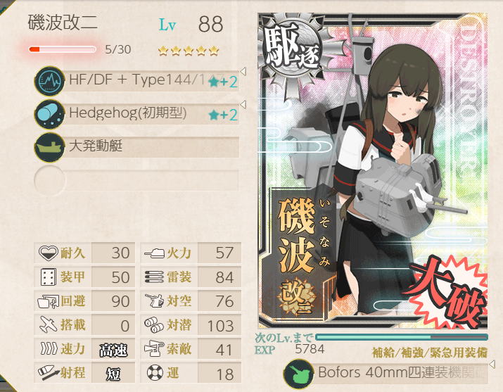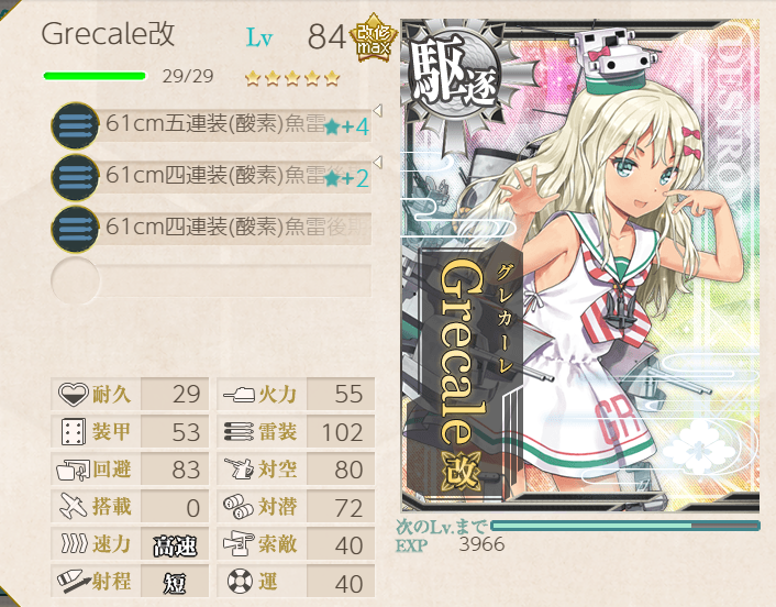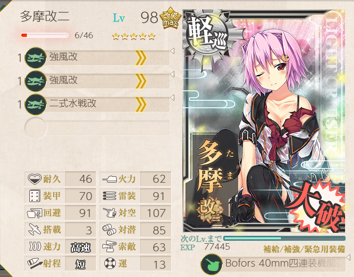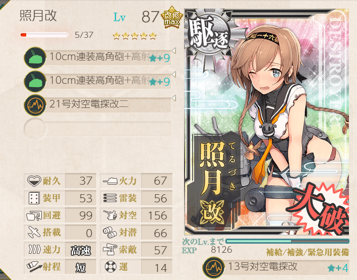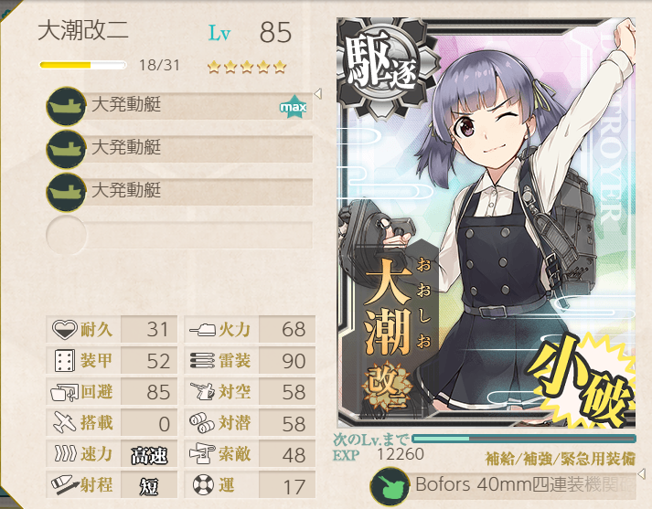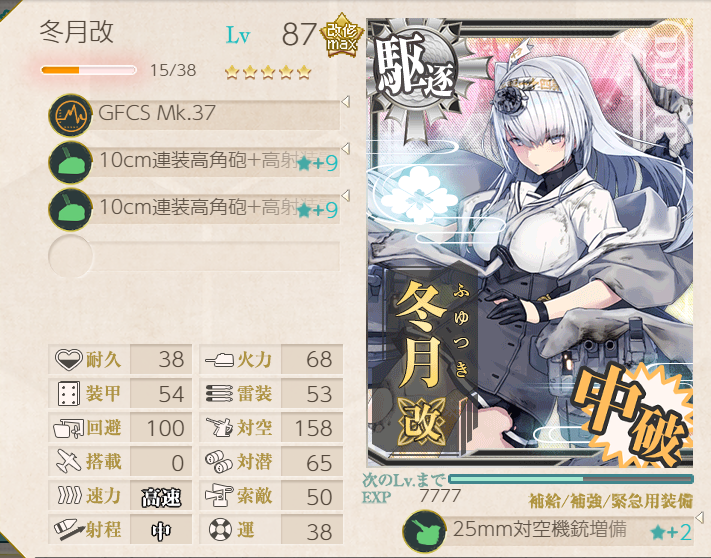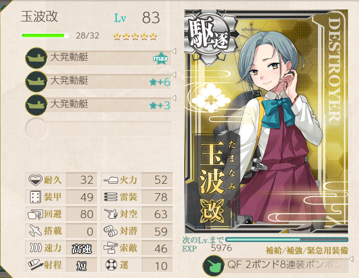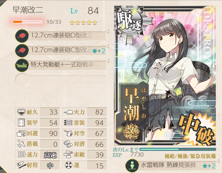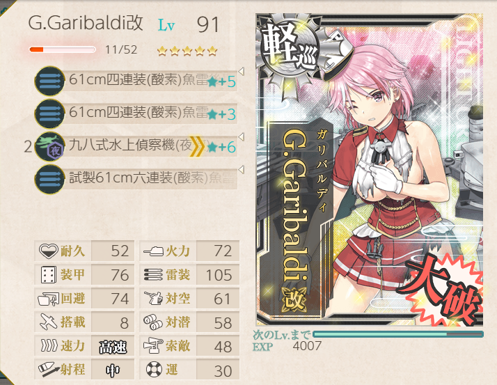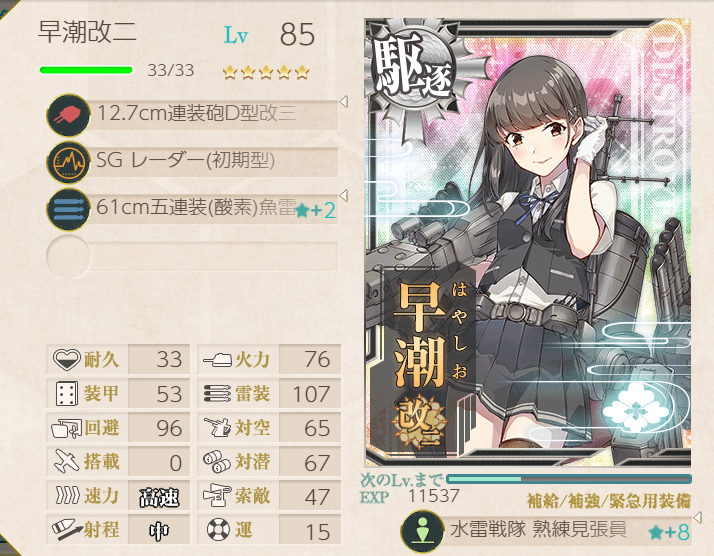 The given composition gives 54 TP per A-rank, which will take 10 runs to deplete the gauge. It's not very feasible to go for S-ranks (I had none), as the boss is tough. You'd have to replace one of the destroyer's equipments with a cut-in setup, which may or may not be worth the loss in TP per run. Overall, it's a pretty easy route, so I opted to just take my time and do it the easy way.