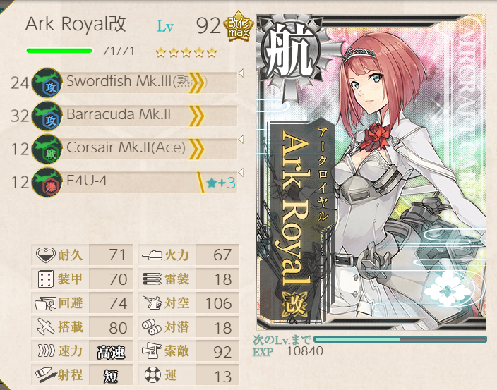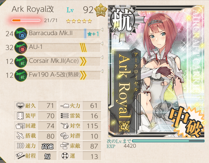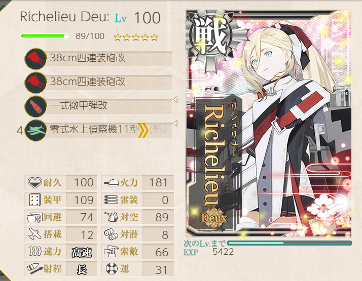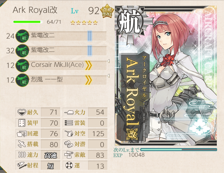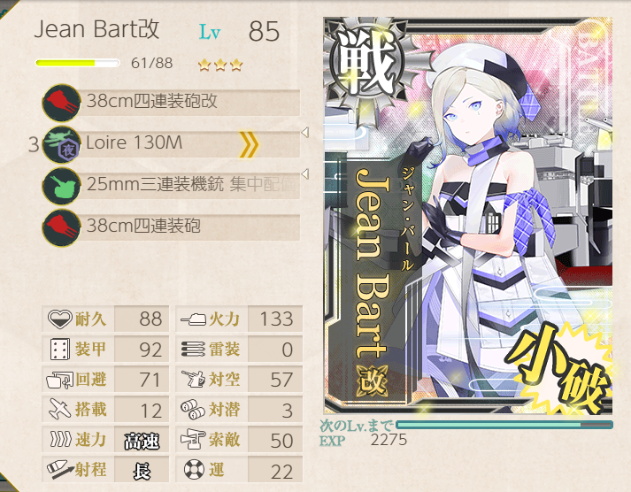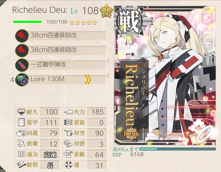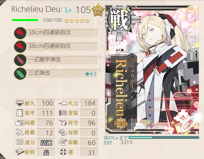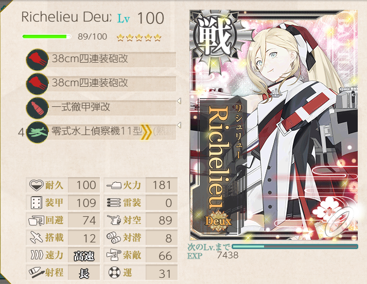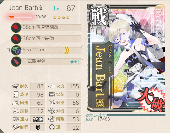 The boss was not particularly challenging, especially with Richelieu and Jean Bart (though the French touch didn't trigger particularly reliably). Ark and Vicky did very well, as well as Zuihou with historical planes. Ultimately, Sheffield brought the boss down to around 100 HP (from full) in night battle, with a cut-in from Jervis doing the rest of the job.