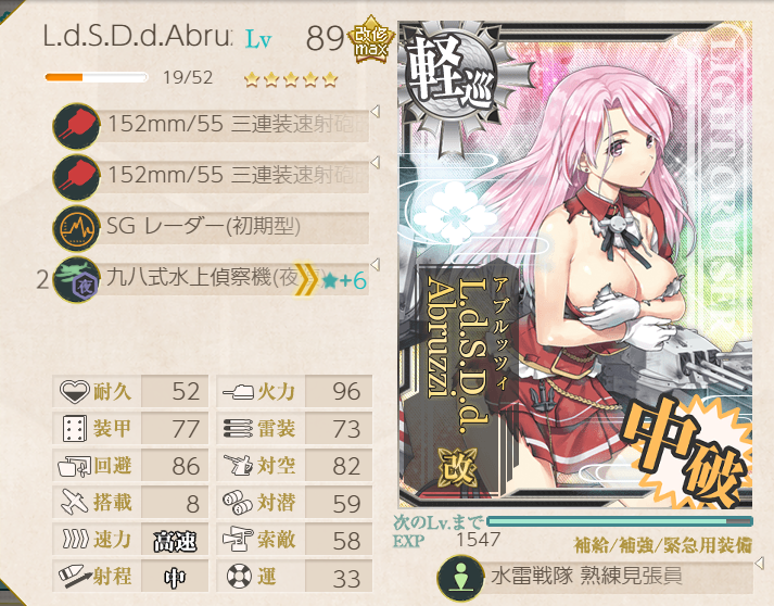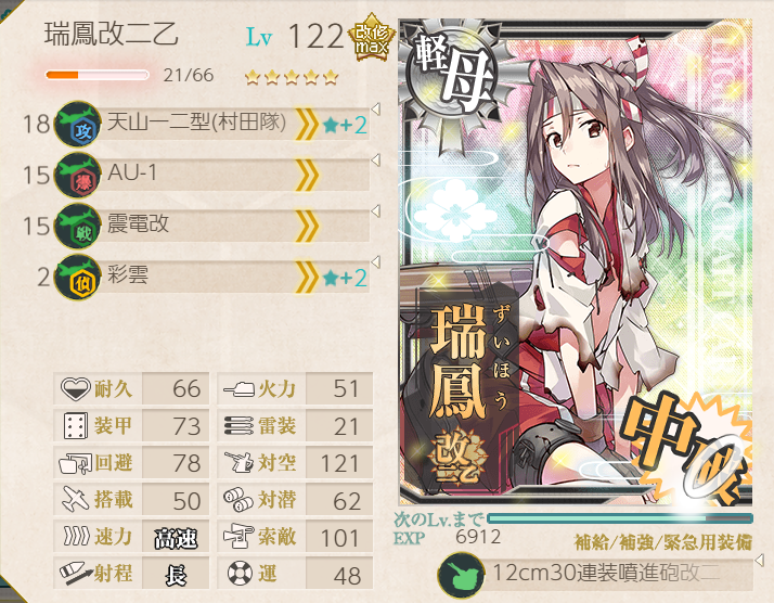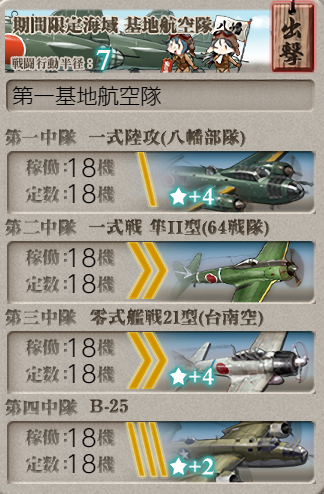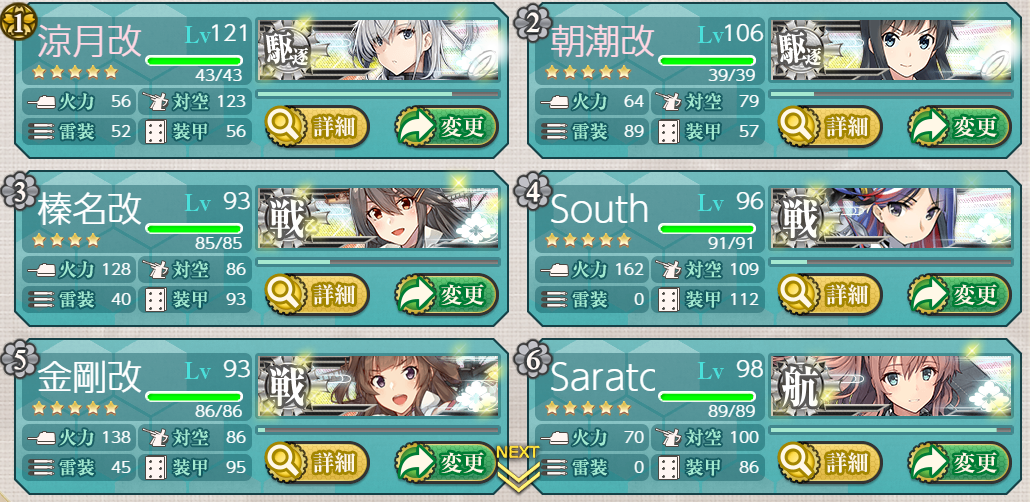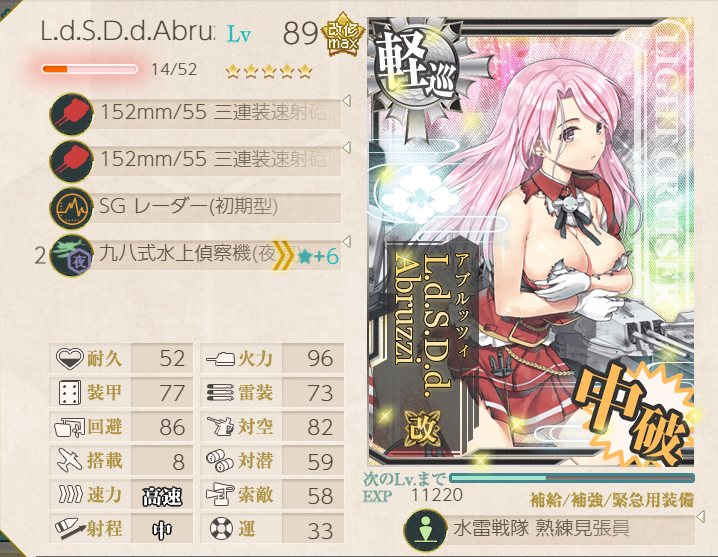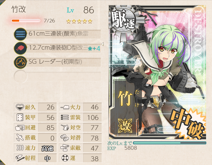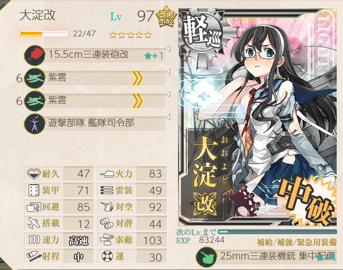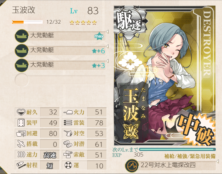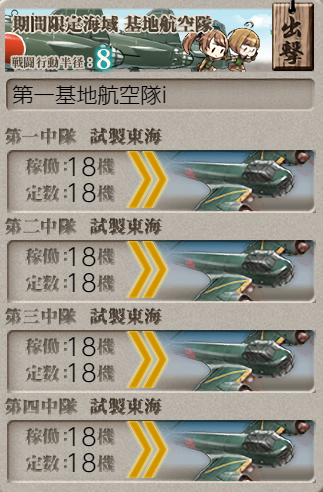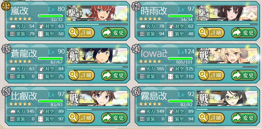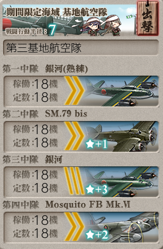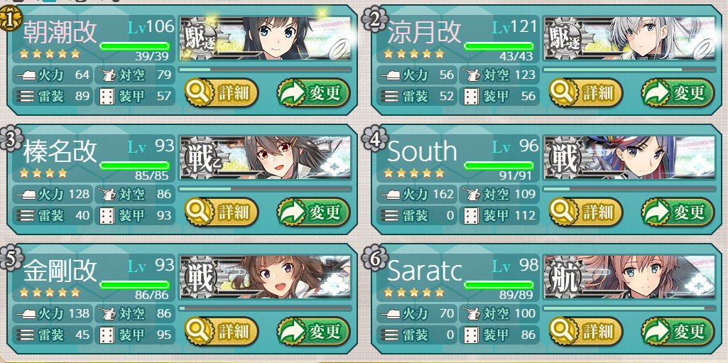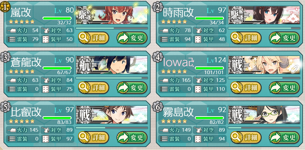 Our fleet was set up for 78 TP on A-ranks, which probably took ~10-15 runs, including retreats. Note that Ooyodo is carrying two Shiuns for oodles of LoS; this protects against routing if a destroyer or two needs to be retreated after H or H2 with the striking force fleet command facility.
