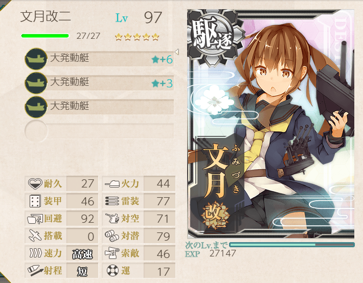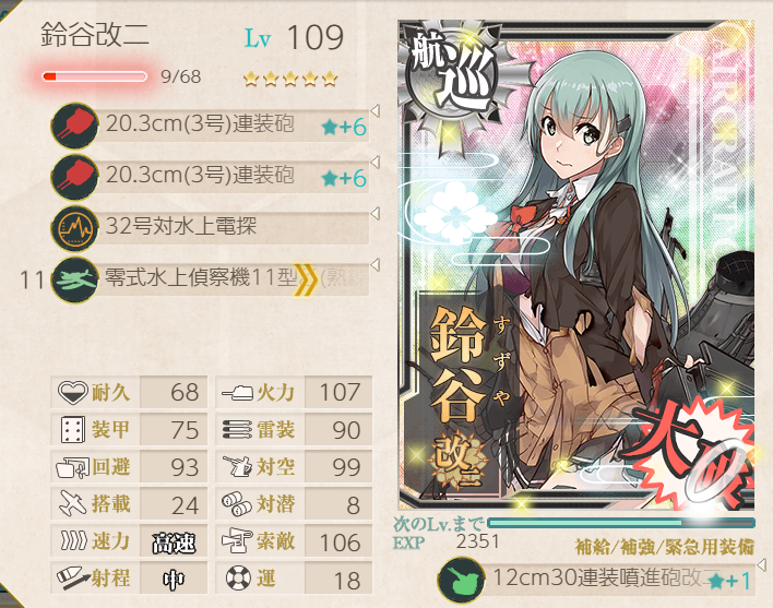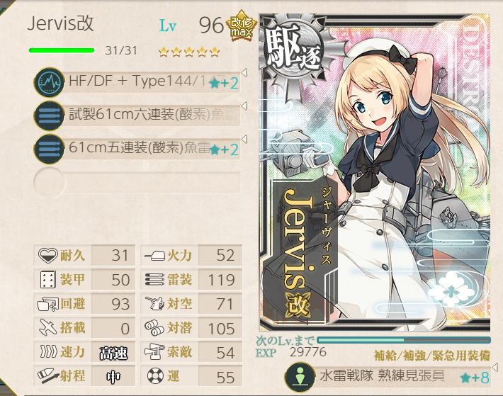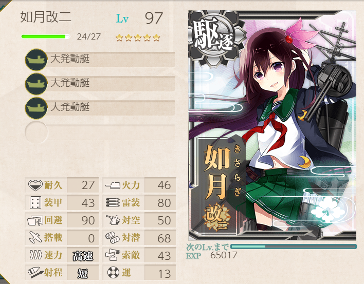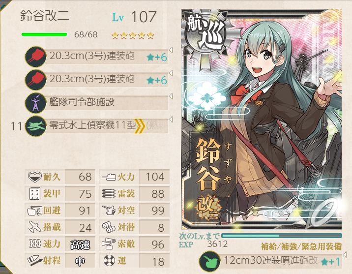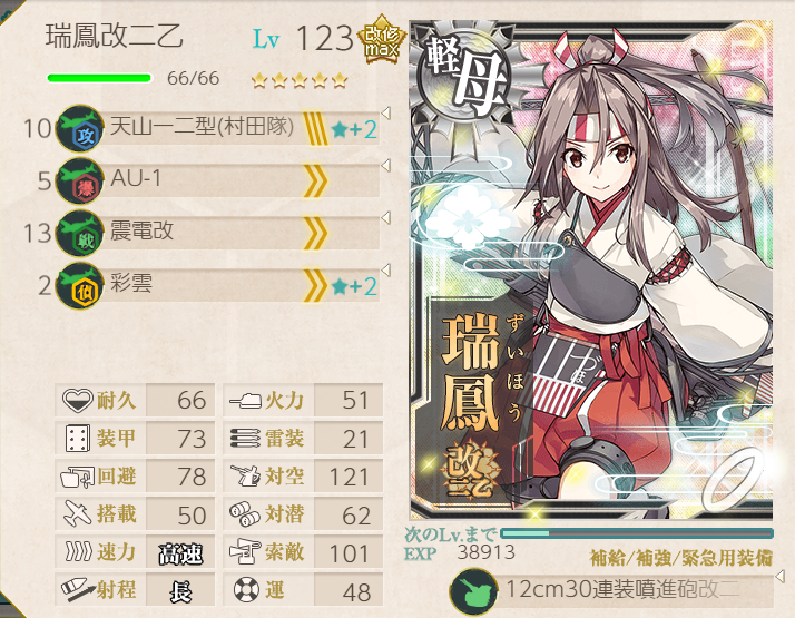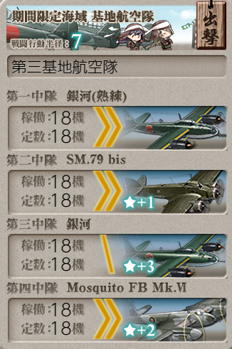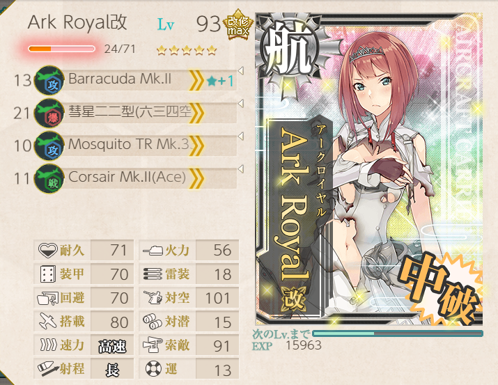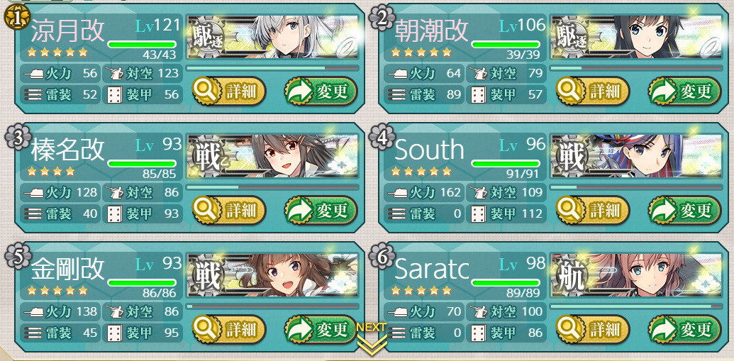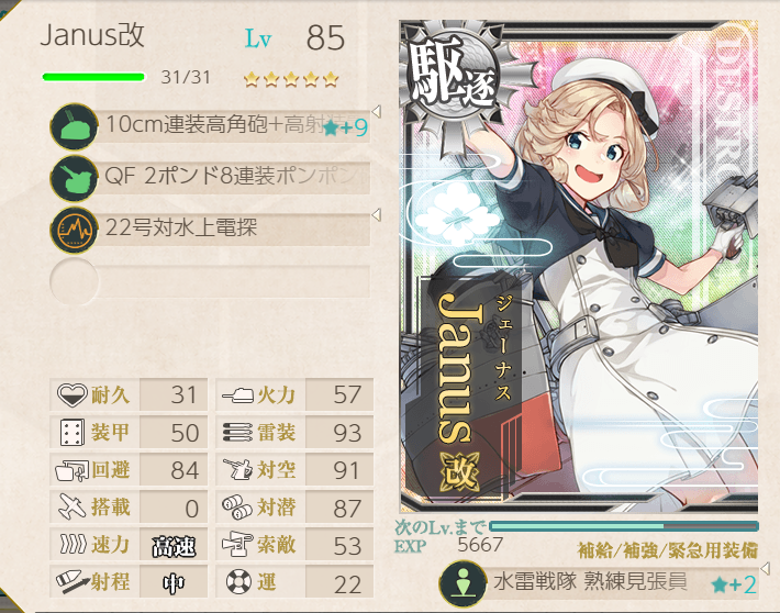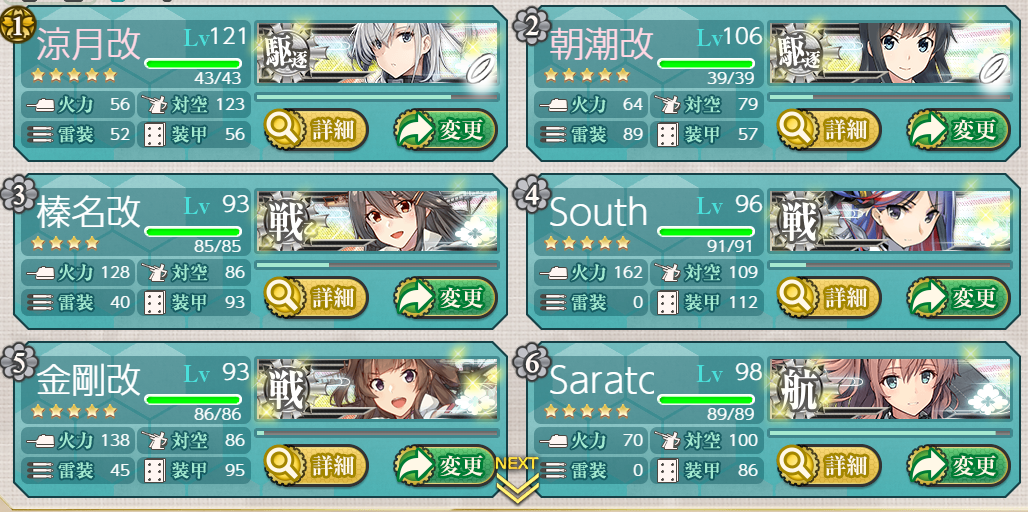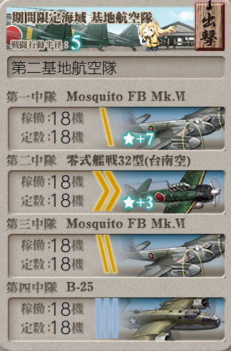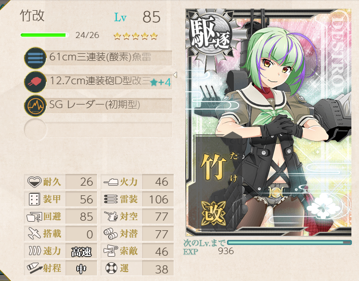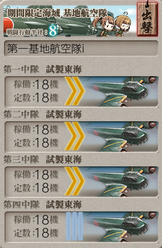 Our fleet was set up for 78 TP on A-ranks, which probably took ~10-15 runs, including retreats. Note that Ooyodo is carrying two Shiuns for oodles of LoS; this protects against routing if a destroyer or two needs to be retreated after H or H2 with the striking force fleet command facility.