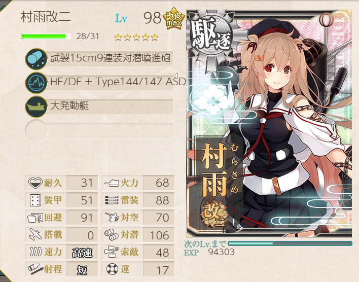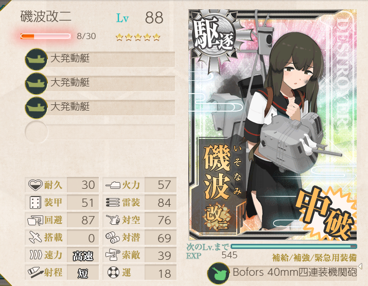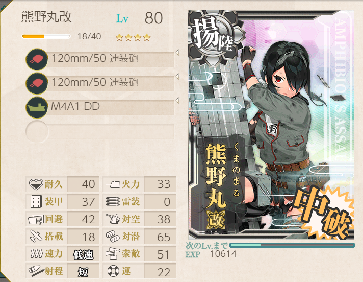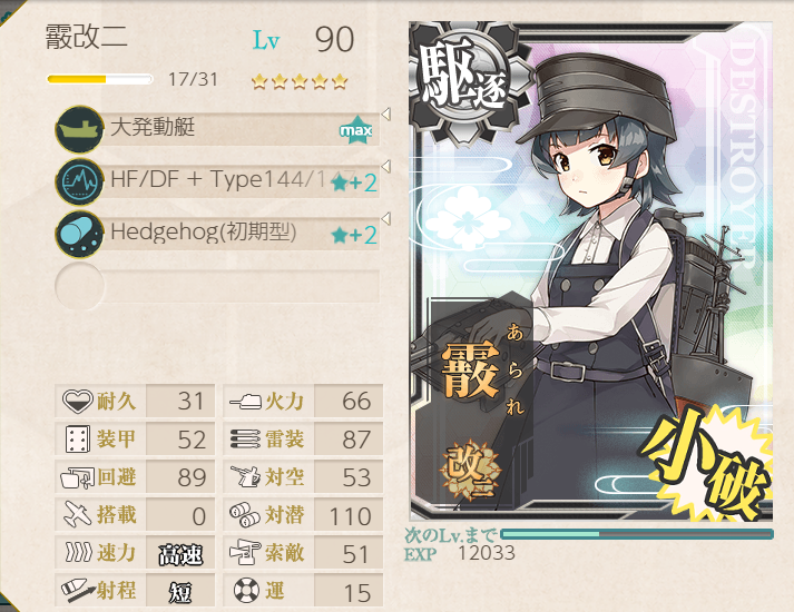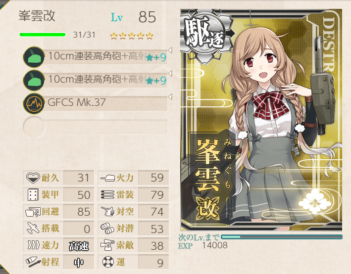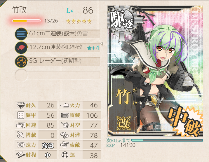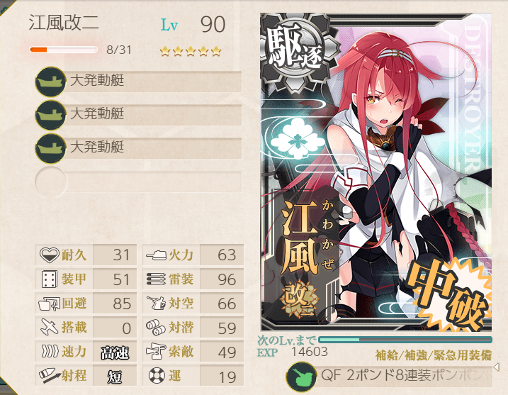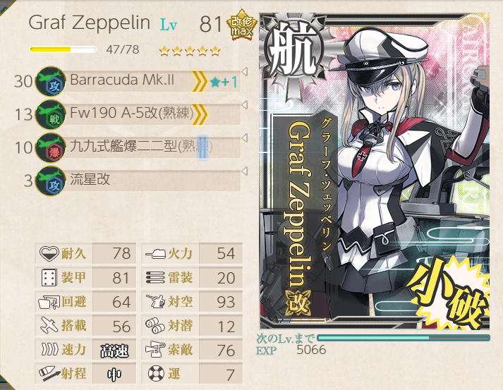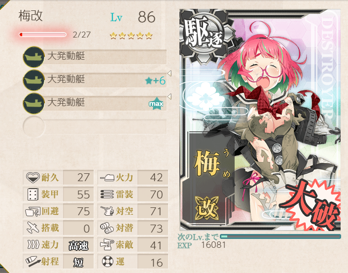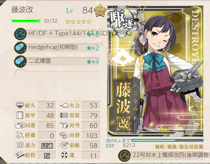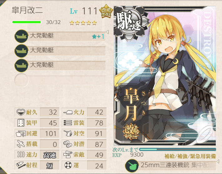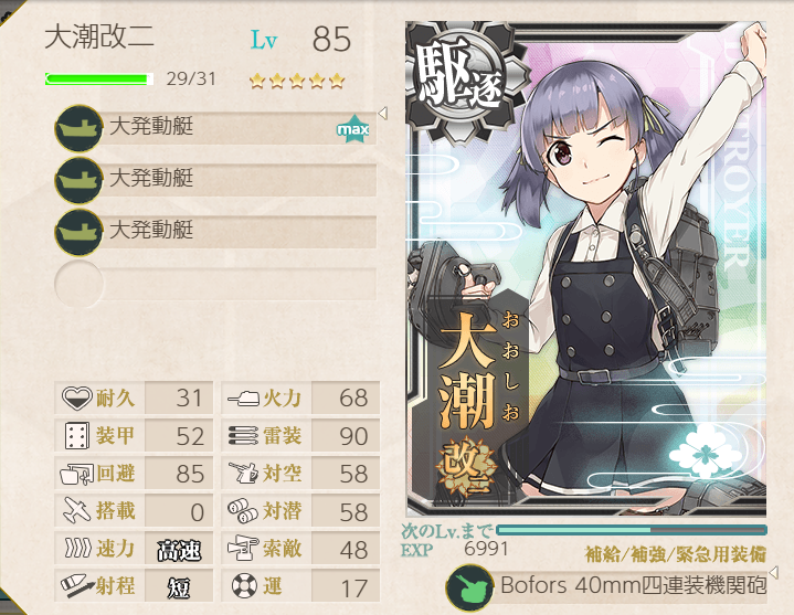 Our fleet was set up for 78 TP on A-ranks, which probably took ~10-15 runs, including retreats. Note that Ooyodo is carrying two Shiuns for oodles of LoS; this protects against routing if a destroyer or two needs to be retreated after H or H2 with the striking force fleet command facility.