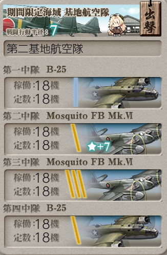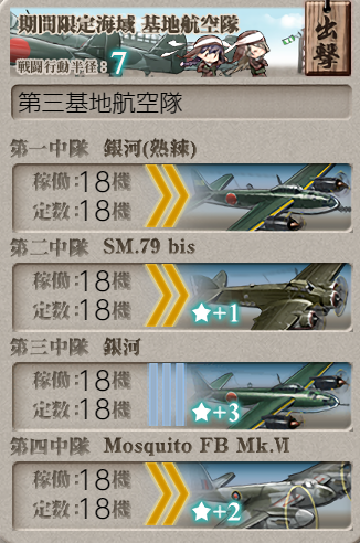 S and V3 were done with the Freetown and Dakar fleets, respectively. V1, however, required a modified fleet with Kumano Maru for routing. We used a Toukai LBAS for node U, an LBAS for V1, and one for routing support. Getting A-ranks here wasn't particularly difficult.
