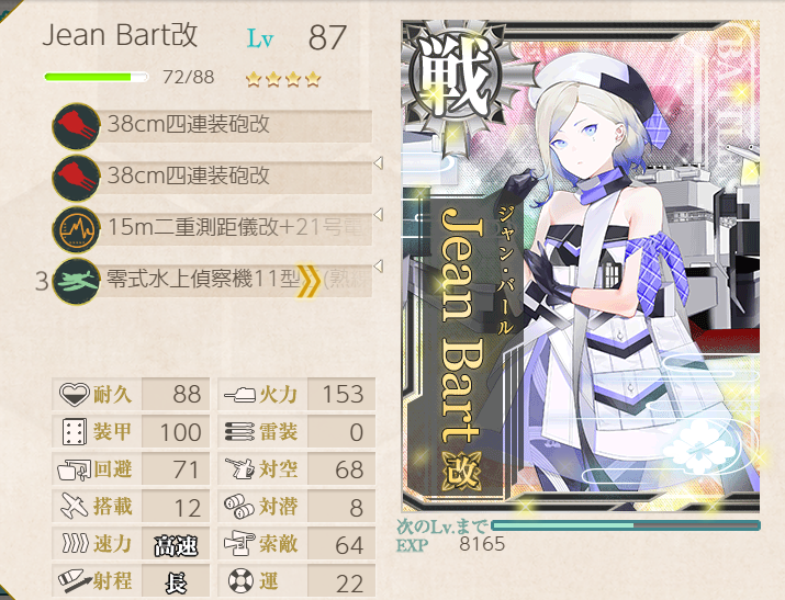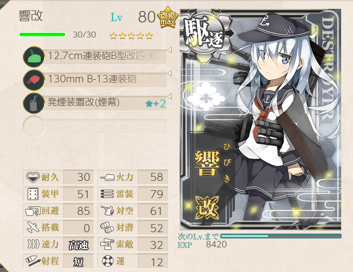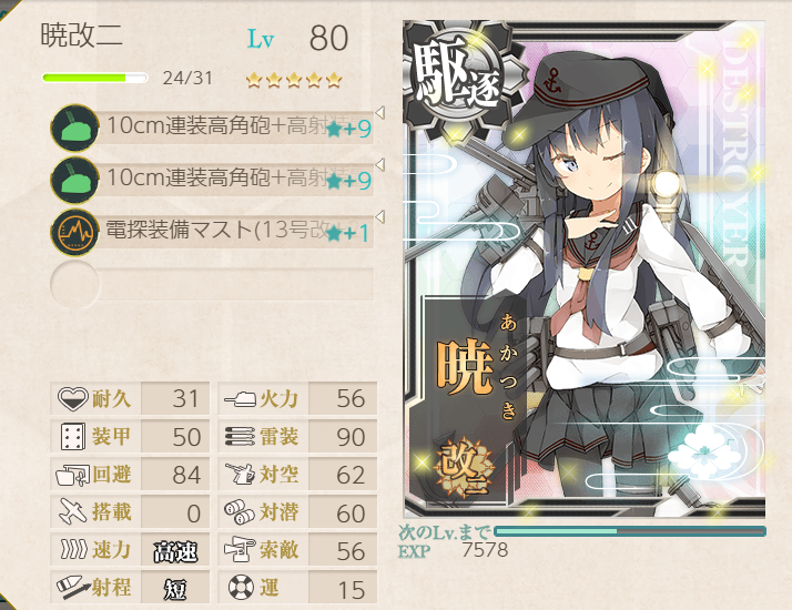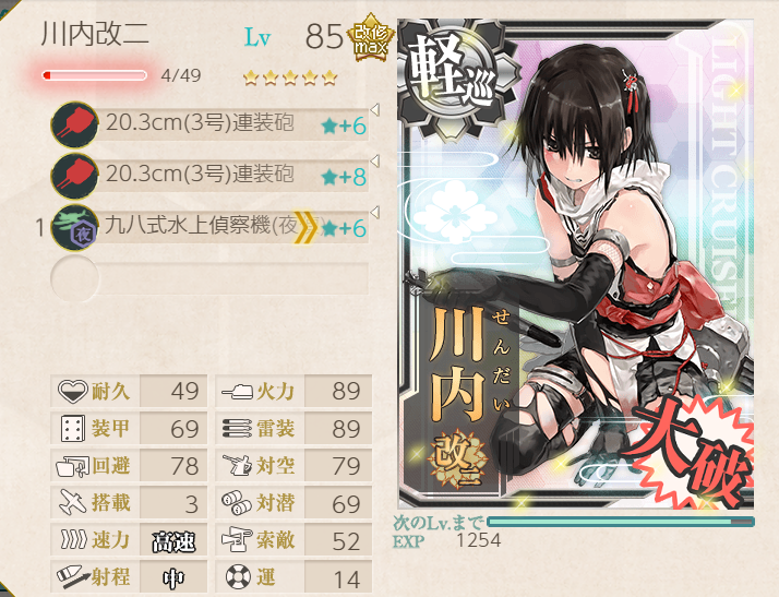 I decided to use Destroyer Division 6 here. They have bonuses and are lower levels than many other ships. Katsuragi was chosen due to the 3-size plane slot: seemed like a good use for the Arctic Gear & Deck Personnel. Sendai has a bonus, and Jean Bart just seemed like a useful battleship to take. Node M was a bit troublesome, but having the two smoke generator kais proved to be essential, along with vanguard formation on every pre-boss node. Still, M did cause several retreats, two of which were on Last Dance! The boss itself wasn't too challenging; Jean Bart, Sendai, and especially DesDiv6 really cleaned up during night battle! Akatsuki got the last hit, but Inazuma and Hibiki also got assists. Kudos all around!![]() | ![]() |