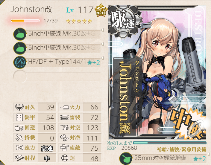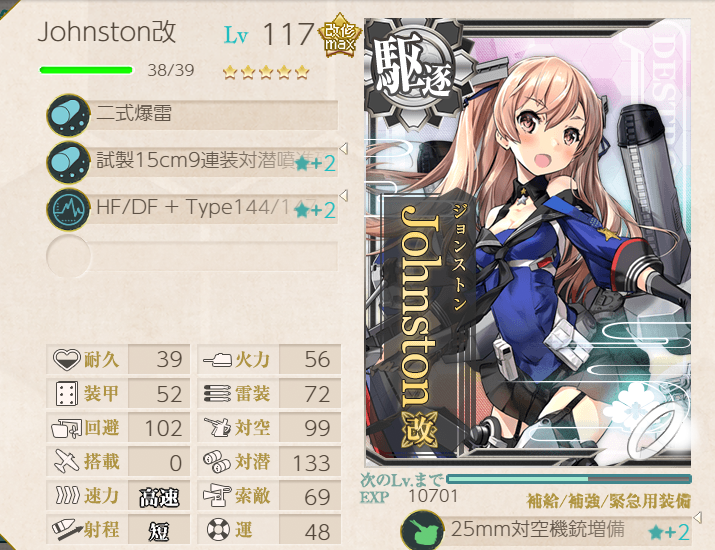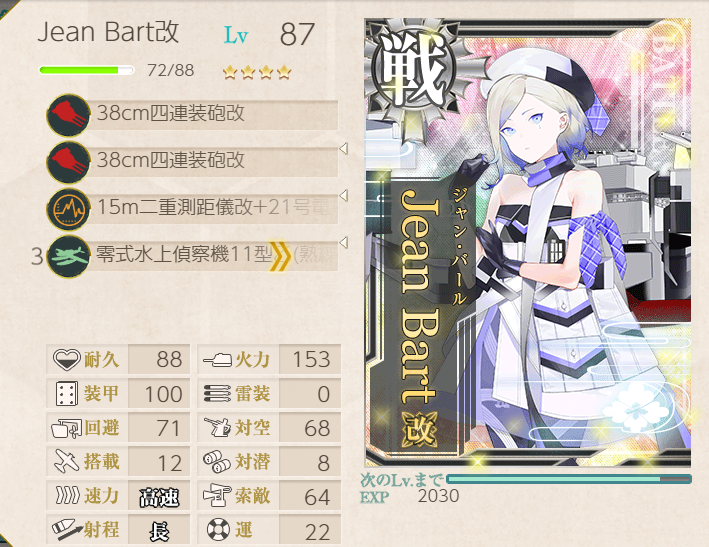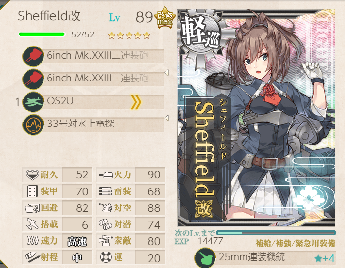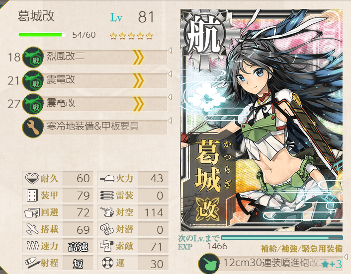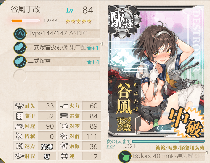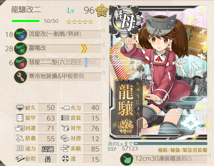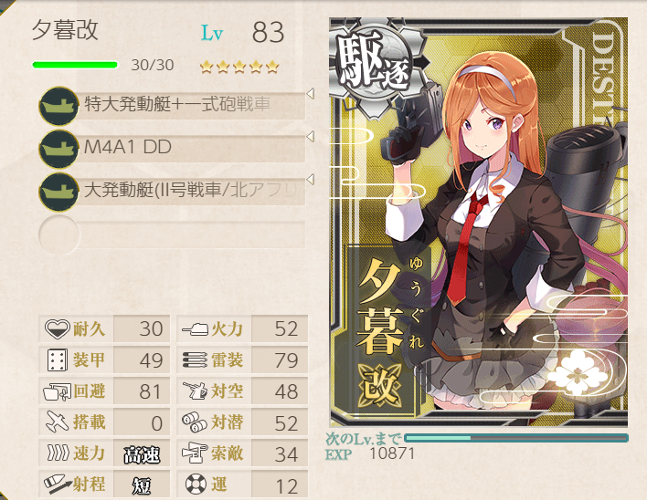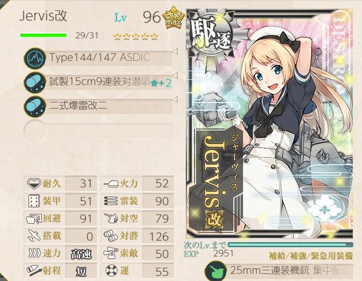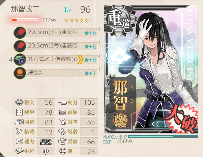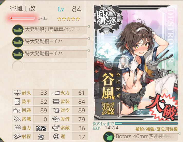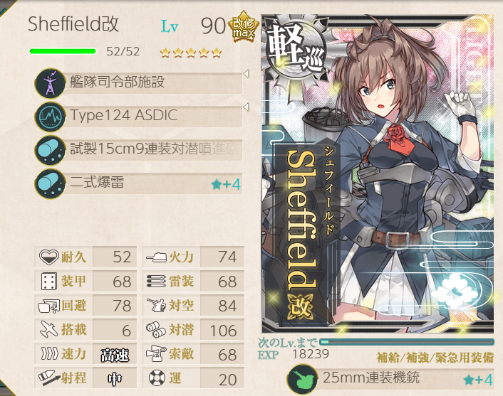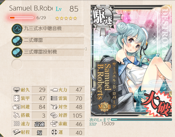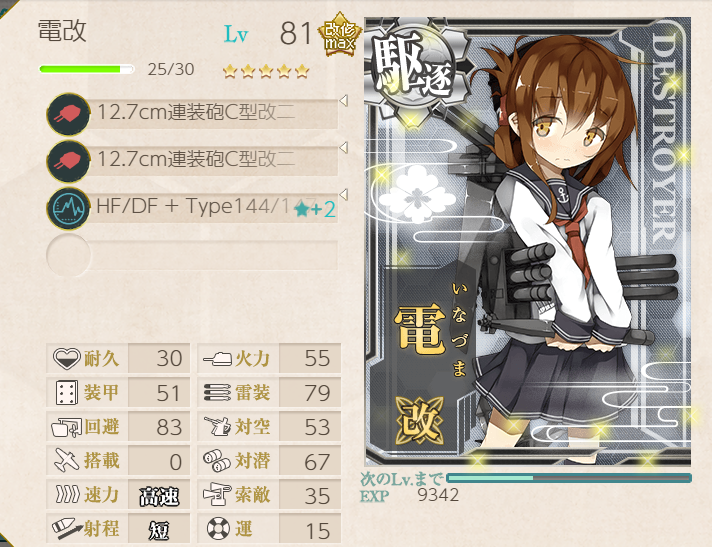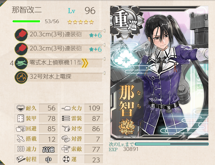 This operation went pretty well; the fleet has many of the special landing crafts with bonuses, so we were pulling 200+ TP each A-rank. Hatsushimo was fitted with landing crafts on most runs; however, she wanted to try a torpedo cut-in to attempt S-ranks. This attempt went pretty well, though we were fine with A-ranks.Main Fleet
