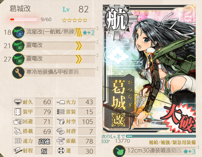The same fleet as above was used for node K, with some equipment changes on Katsuragi (torpedo bomber and two fighters) and Inazuma (sonar instead of barrage balloon). We did use node support; however, not sure it was needed. It did help a little on some of the nodes en route. Note that, other than K and H, vanguard formation was used. H used line abreast and smoke, and K was line ahead. LBAS was used as before, with the first base split between I and K, and the second base fully at K.![]() | ![]() |