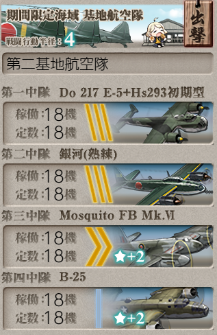 The same fleet as the boss phase of E1, but with a little equipment switchup. We did smoke and vanguard on D, as the equipment was already present.![]() | ![]() |